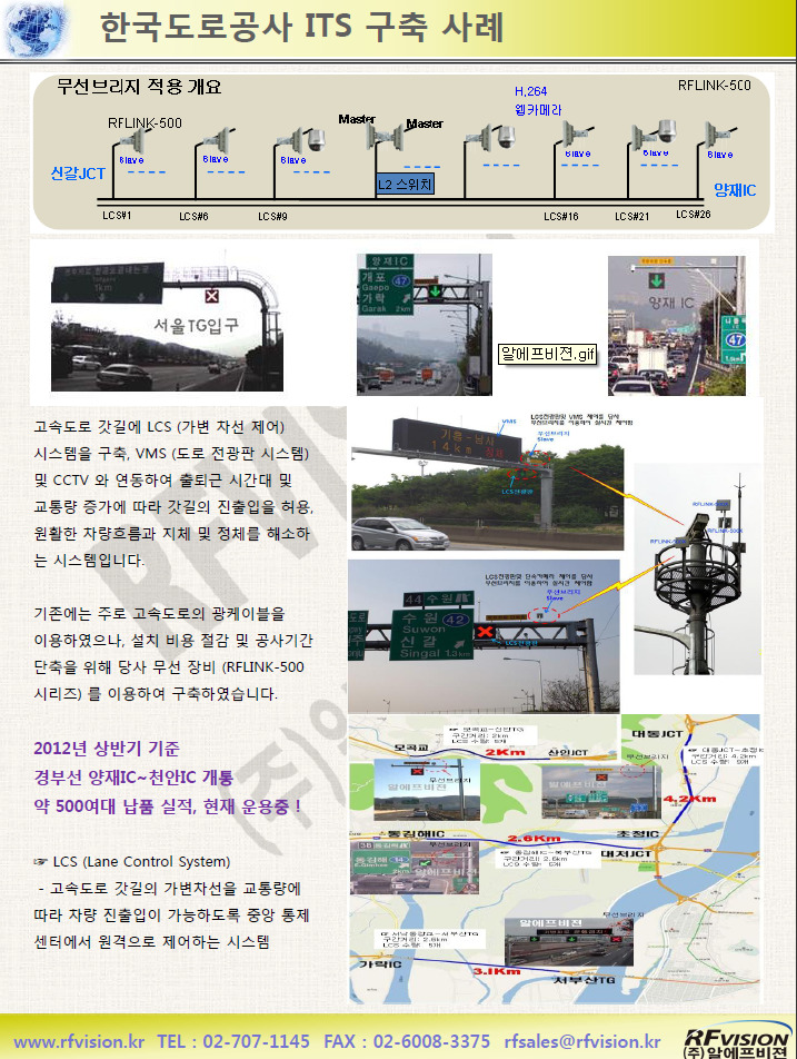 기존에는 주로 고속도로의 광케이블을 이용하였으나, 설치 비용 절감 및 공사기간 단축을 위해 당사 무선 장비 (RFLINK-500 시리즈) 를 이용하여 구축하였습니다.